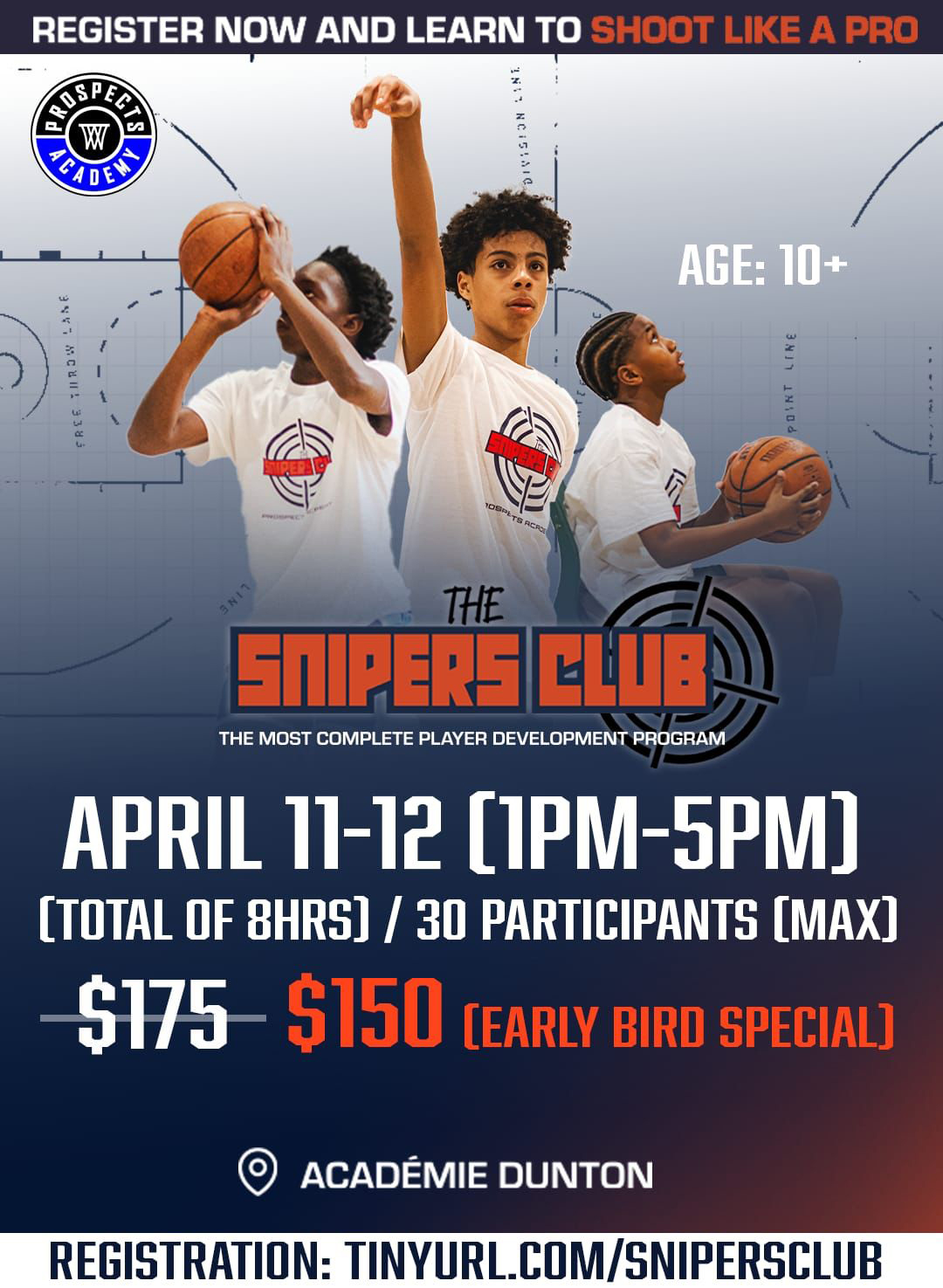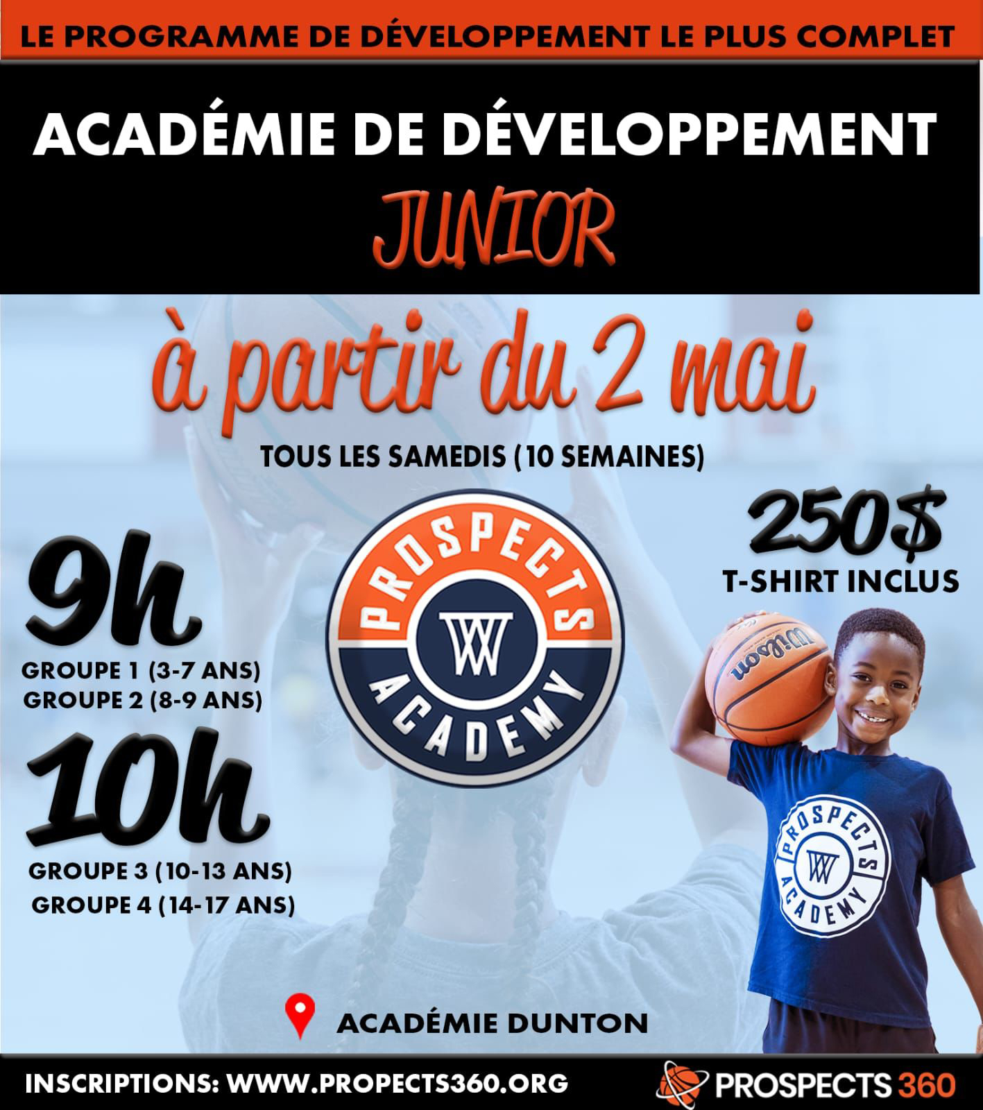 Pour vous inscrire au programme de perfectionnement (ACADÉMIE JUNIOR / JUNIOR ACADEMY) de Prospects 360, veuillez remplir le formulaire suivant. La session débutera le 14 février 2026. Elle compte 10 séances d’entrainement d’une heure chacune. Les entraînements auront lieu à l’Académie Dunton, située au 5555 rue de Boucherville, Montréal, QC, H1K 4B6.